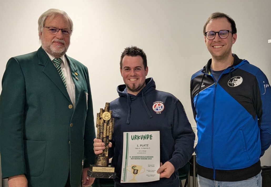 Im Rahmen der Siegerehrung wurden die Pokale und Urkunden übergeben. Bei unserem 15. Wanderpokalschießen für Firmen-Abteilungen, Gruppen und andere Sportvereine ging der große Wanderpokal an die 4. Herren-Mannschaft der TSG A‑H und damit bereits zum fünften Mal insgesamt. Das letzte Mal konnte sich die TSG den Pokal im Jahr 2019 sichern.